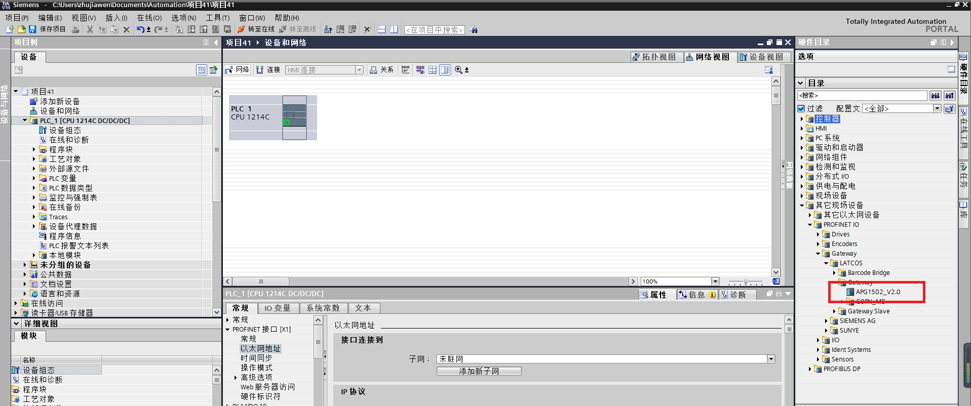 ③在網絡視圖里,點擊其他現場設備,在PROFINET IO下IO/GateWay/LATCOS/GateWay/APG1502_V2.0,把APG1502_V2.0拖到網絡視圖里,然后右鍵點擊未分配,分配給新I/O控制器.