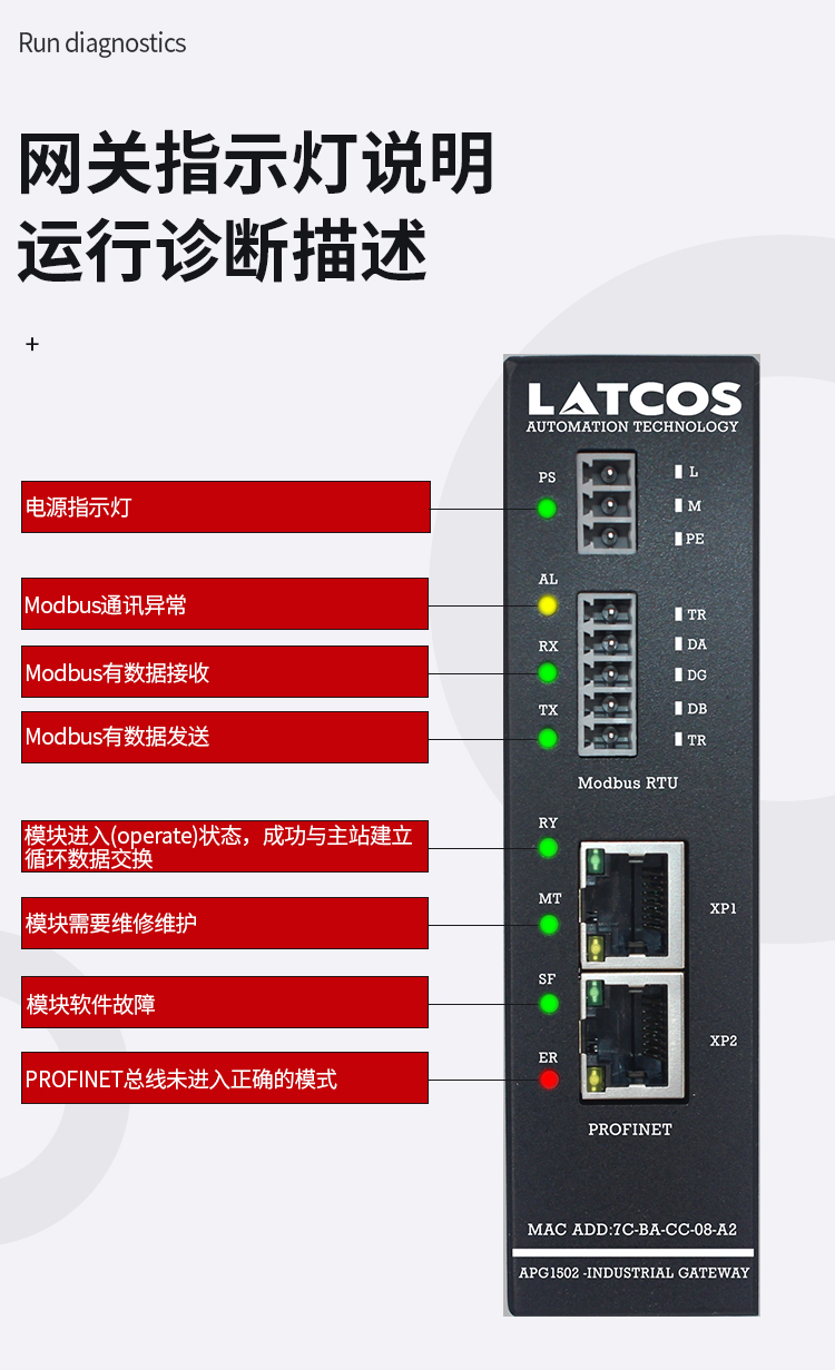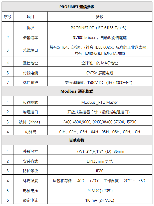 LED 指示分為三類指示。其中包括電源指示,Modbus 狀態指示,profinet 狀態指示,定義如表 下圖所示