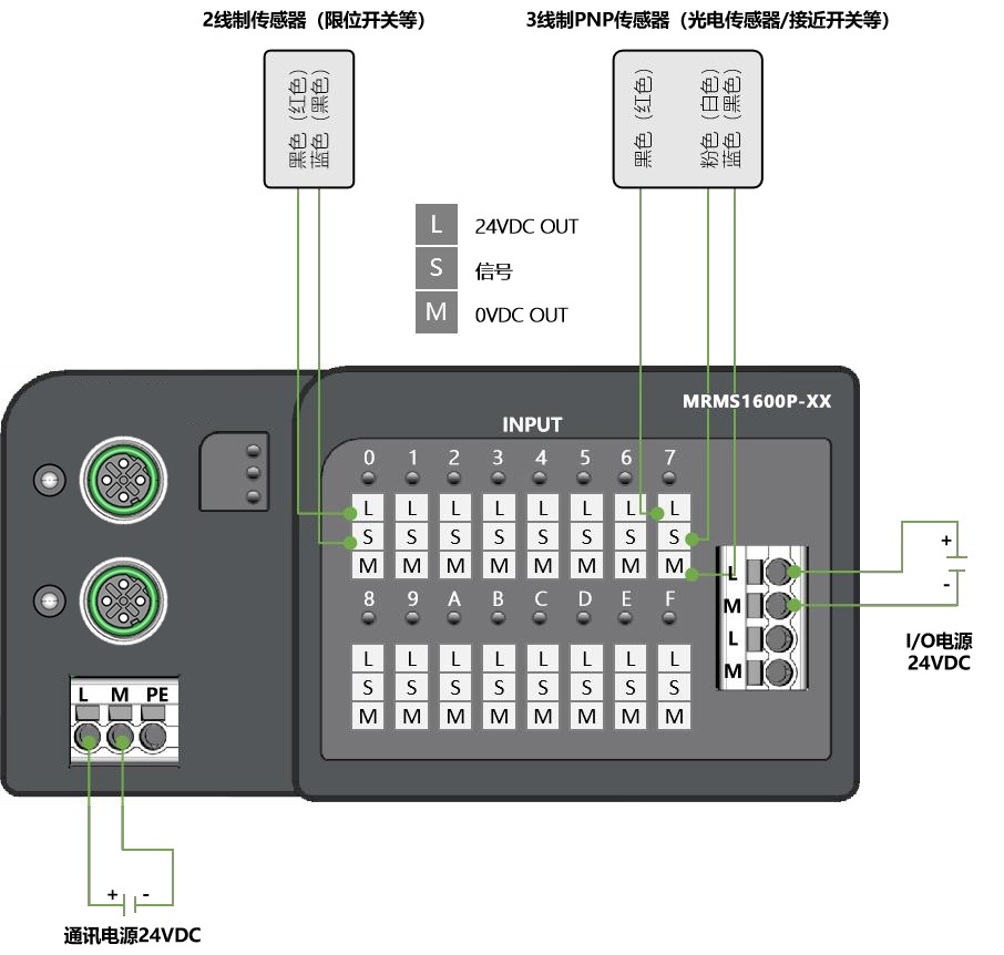 面板式快接線分布式I/O,CC-Link IE FieldBasic通訊,2xM12,可級聯;數字量16入 PNP,24VDC,歐式彈簧端子;導軌安裝&打孔安裝(下單時需備注)