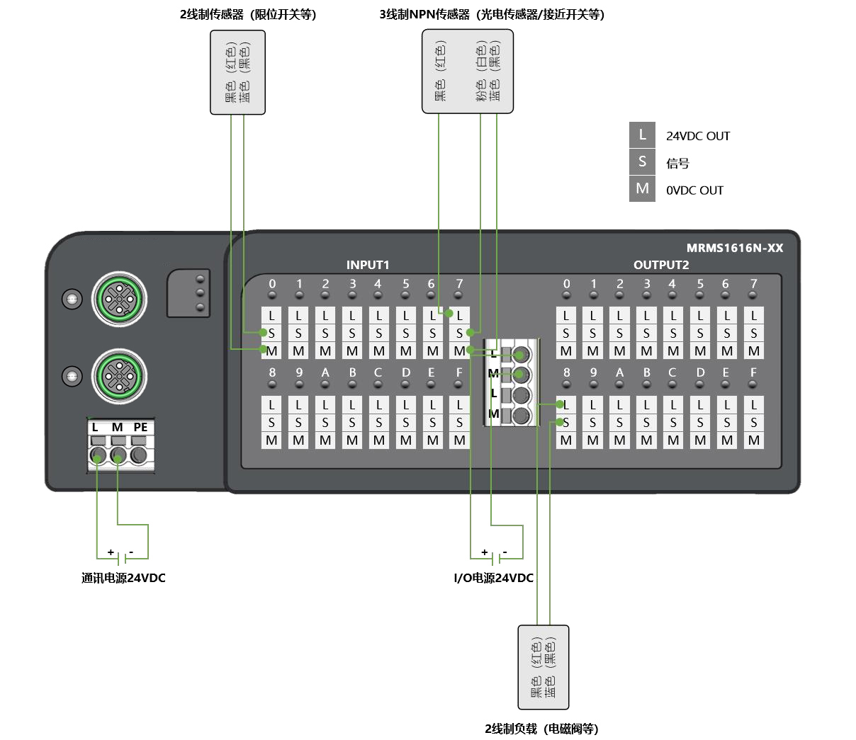 面板式快接線分布式I/O,EtherCAT通訊,2xM12,可級聯;數字量16入16出 NPN,24VDC,0.5A,歐式彈簧端子;導軌安裝&打孔安裝(下單時需備注)