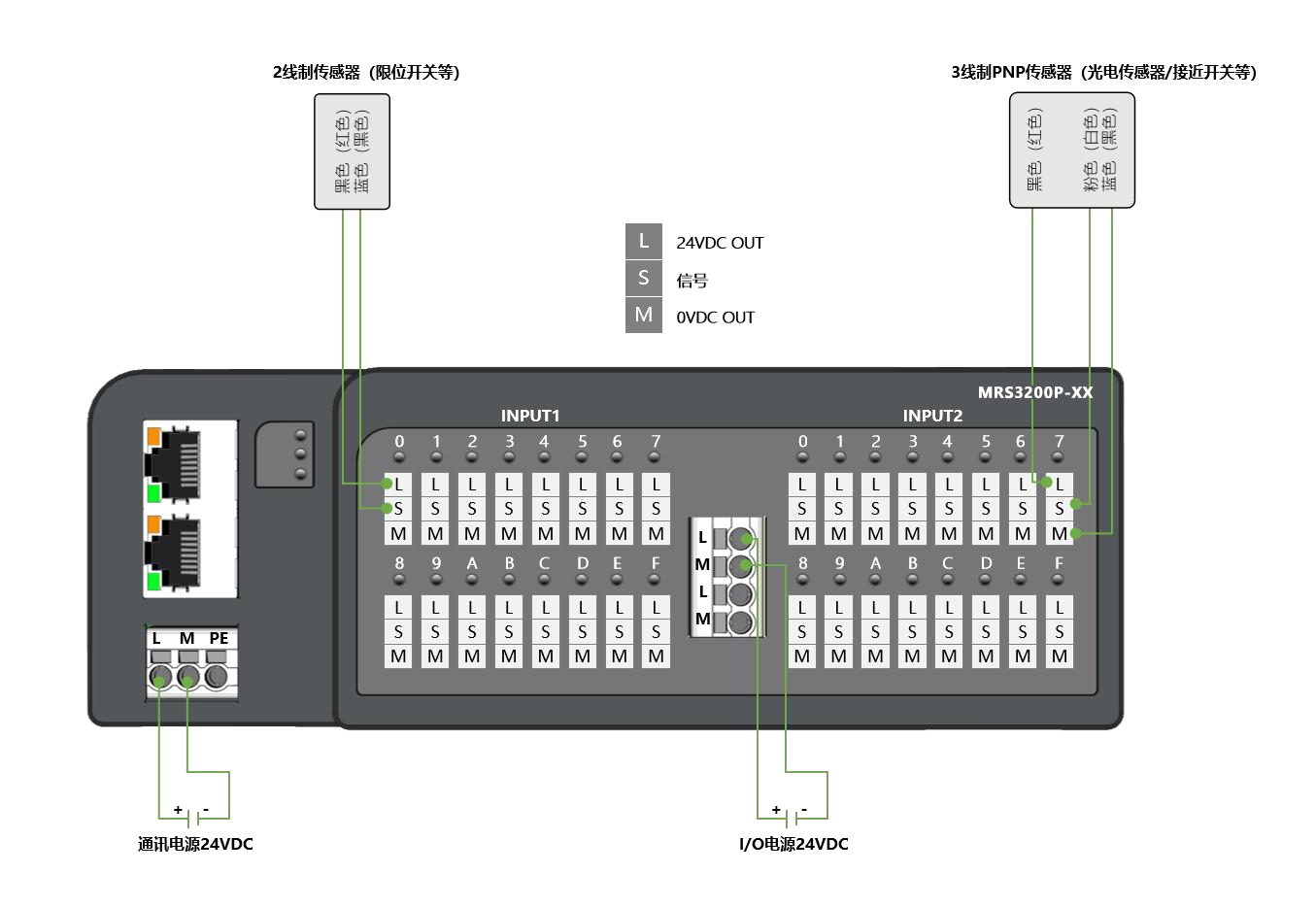 面板式快接線分布式I/O,CC-Link IE FiledBasic通訊,2xRJ45,可級聯(lián);數字量32入 PNP,24VDC,歐式彈簧端子;導軌安裝&打孔安裝(下單時需備注)