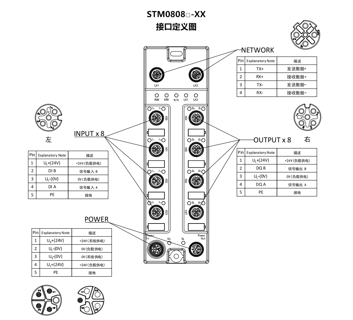 高防護現場級分布式I/O,2xM12,D-Code,可級聯,支持PROFINET RT協議,8DI_PNP,8DO_PNP,晶體管,0.5A,24VDC